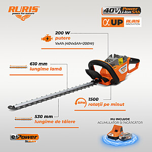 Cu un motor electric cu perii și o baterie Li-Ion 40V 5 Ah (achiziționată separat), electrofoarfeca noastră îți oferă puterea necesară pentru a tăia cu ușurință crengi și plante de diverse dimensiuni. Ai la îndemână o putere totală de 200 Wh, ceea ce înseamnă că poți realiza tăieturi rapide și precise într-un timp mai scurt.